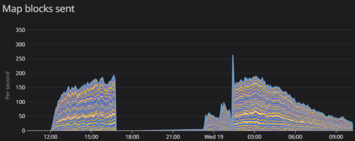 At some point, we could see a whole hour's delay. So for players, it looked like they could not build a plot, but the reality is that they didn’t see the operation conclude until after more than an hour delay. This is all very obvious with the clarity of hindsight, but it took a while for us to troubleshoot this and find the root cause. As we were still in discovery mode, we opted on the side of caution and allowed the service to drain itself at its pace to make sure no player state got lost, which took a couple of hours.