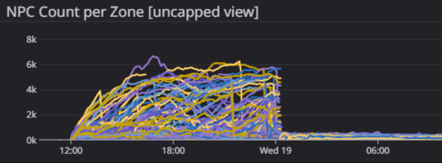 After about an hour, we started noticing that servers handling some of the more populated zones were starting to grow an alarming number of NPCs with a commensurate effect on performance. At the same time, early signals from the ground that we obtained through Discord started mentioning heavy rubber-banding in some zones which would be an expected consequence.