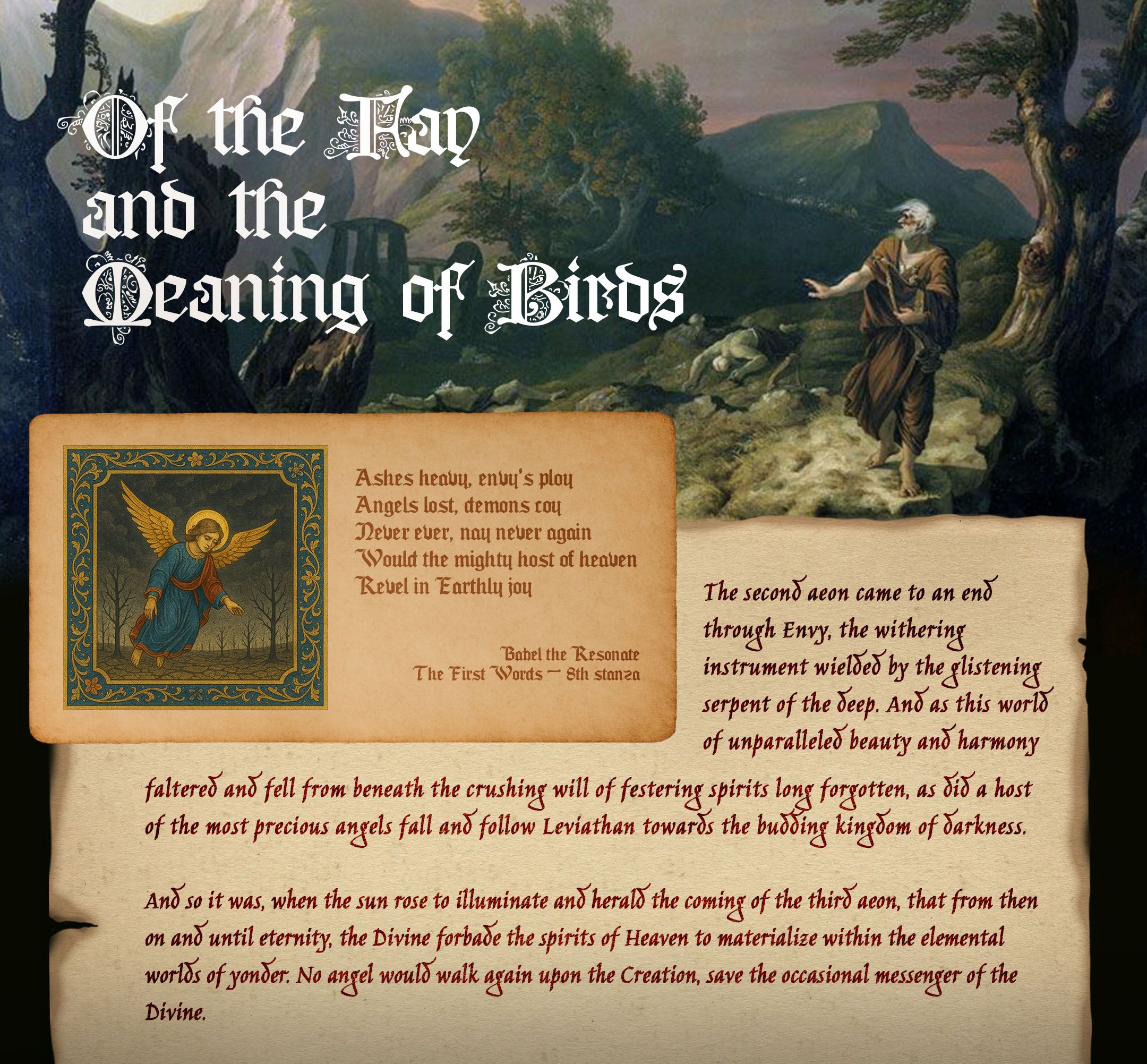 And so it was, when the sun rose to illuminate and herald the coming of the third aeon, that from then on and until eternity, the Divine forbade the spirits of Heaven to materialize within the elemental worlds of yonder. No angel would walk again upon the Creation, save the occasional messenger of the Divine.