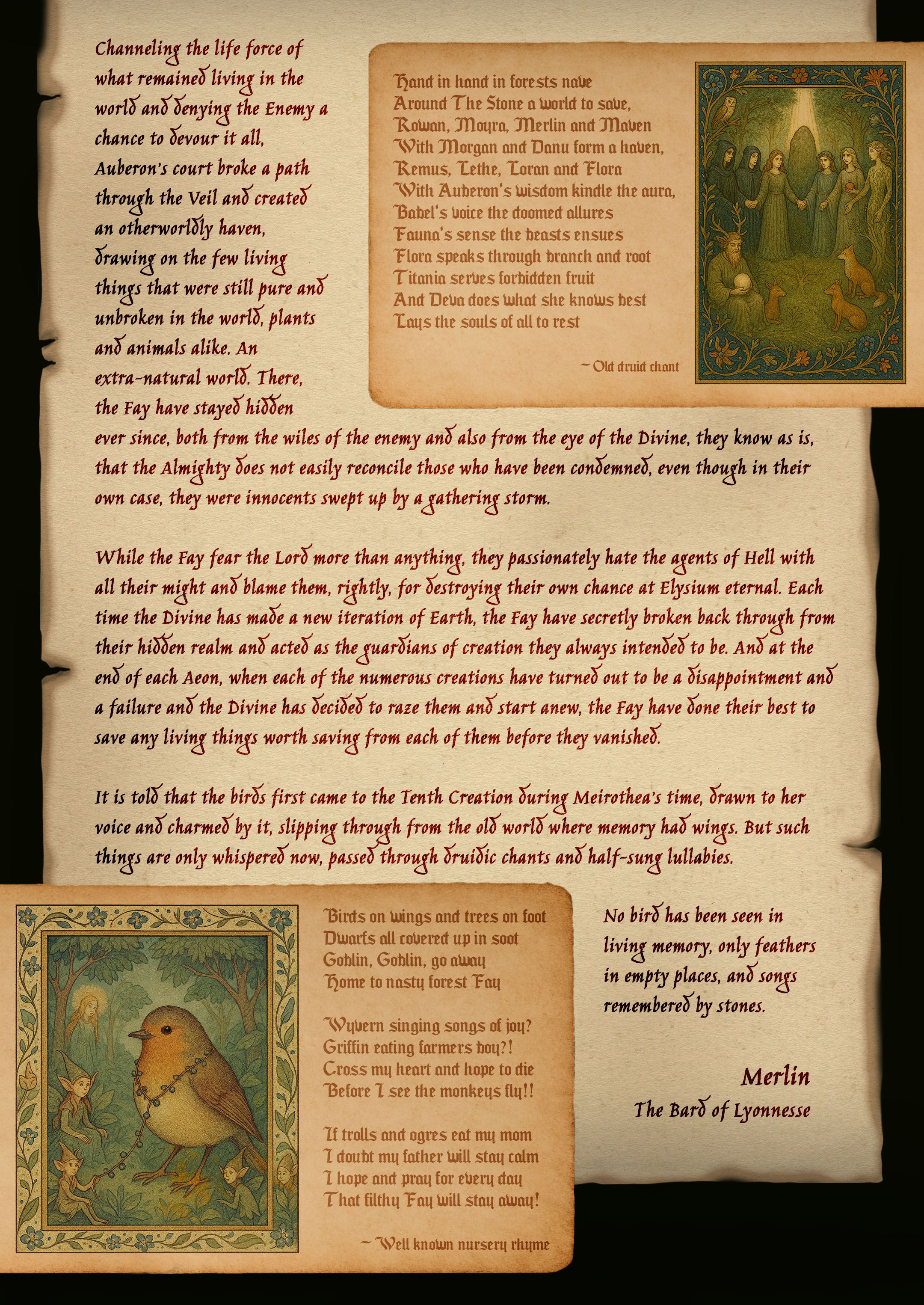 It is told that the birds first came to the Tenth Creation during Meirothea’s time, drawn to her voice and charmed by it, slipping through from the old world where memory had wings. But such things are only whispered now, passed through druidic chants and half-sung lullabies. No bird has been seen in living memory, only feathers in empty places, and songs remembered by stones.