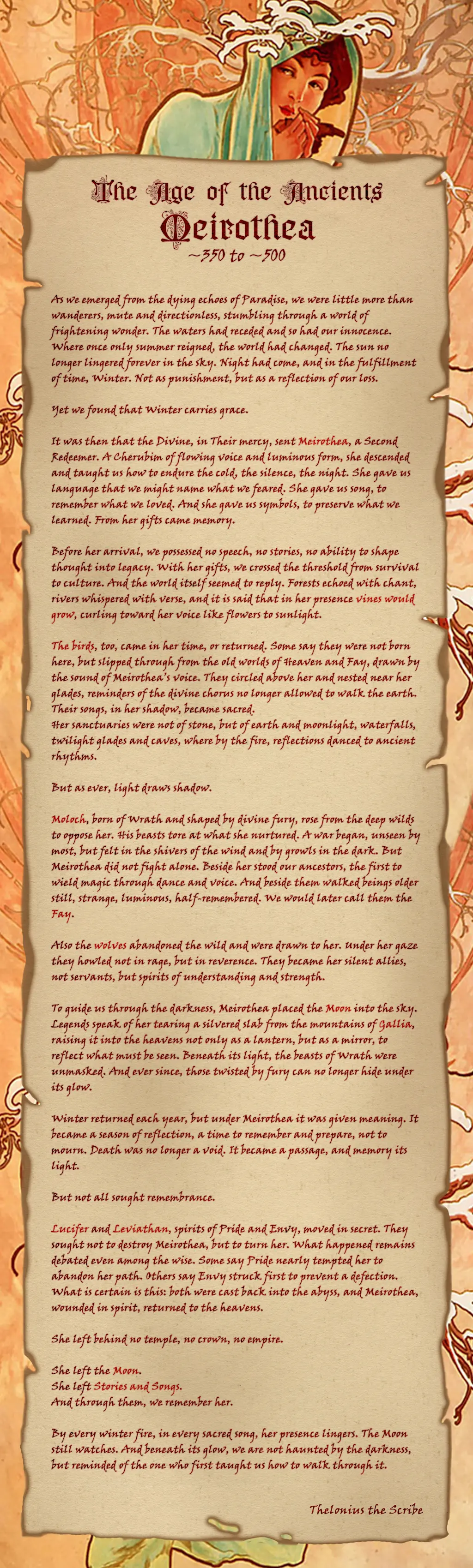 It was then that the Divine, in Their mercy, sent Meirothea, a Second Redeemer. A Cherubim of flowing voice and luminous form, she descended and taught us how to endure the cold, the silence, the night. She gave us language that we might name what we feared. She gave us song, to remember what we loved. And she gave us symbols, to preserve what we learned. From her gifts came memory.