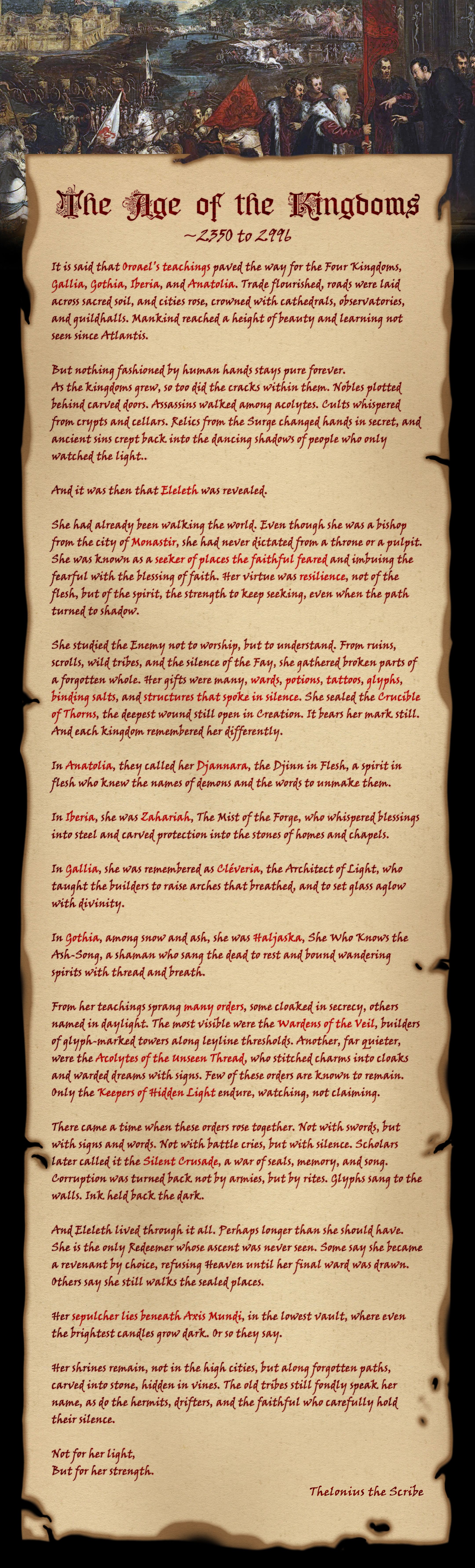 On dit que les enseignements d'Oroael ont ouvert la voie aux quatre royaumes, Gallia, Gothia, Iberia et Anatolia. Le commerce a prospéré, des routes ont été tracées sur le sol sacré et des villes se sont élevées, couronnées de cathédrales, d'observatoires et de salles des guildes. L'humanité atteint un niveau de beauté et d'érudition inégalé depuis l'Atlantide.