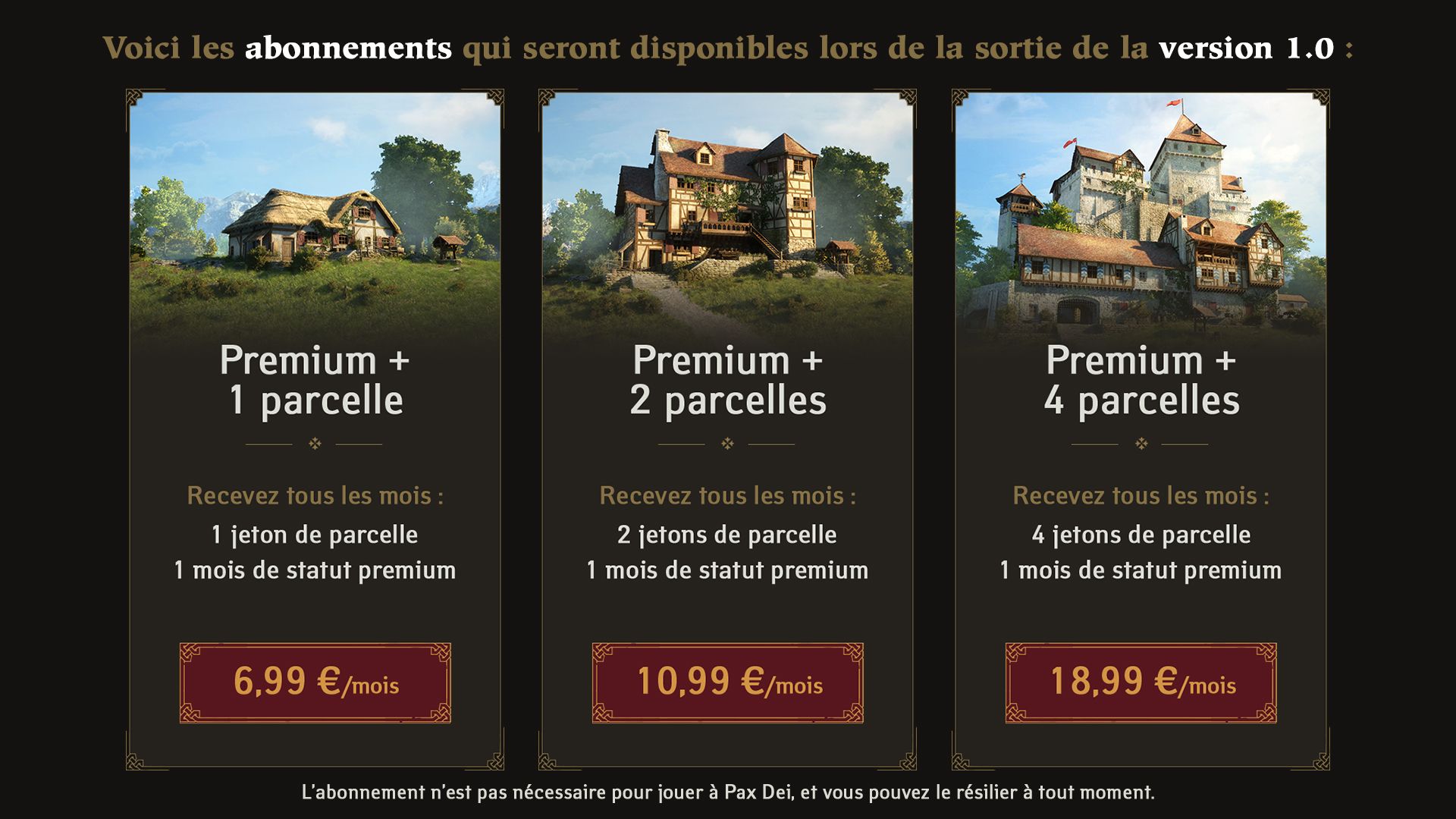 Les abonnements ne seront introduits qu’après la sortie de l’accès anticipé. La date de cette sortie n’est pas encore fixée. Après la sortie de la version 1.0, vous pourrez souscrire un abonnement à tout moment et améliorer votre expérience de jeu en bénéficiant d’avantages supplémentaires. Votre abonnement sera ensuite renouvelé automatiquement chaque mois. L’abonnement n’est pas nécessaire pour jouer à Pax Dei, et vous pouvez le résilier à tout moment.